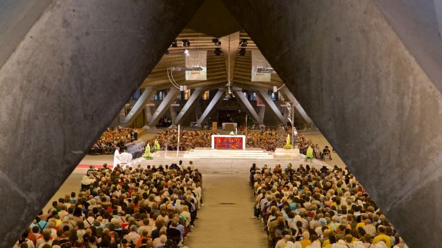 Tiene capacidad para hasta 25.000 personas, lo que la convierte en una de las iglesias más grandes del mundo en términos de aforo. Su diseño moderno de hormigón contrasta claramente con las basílicas más antiguas y refleja la adaptación de Lourdes a la peregrinación masiva moderna.